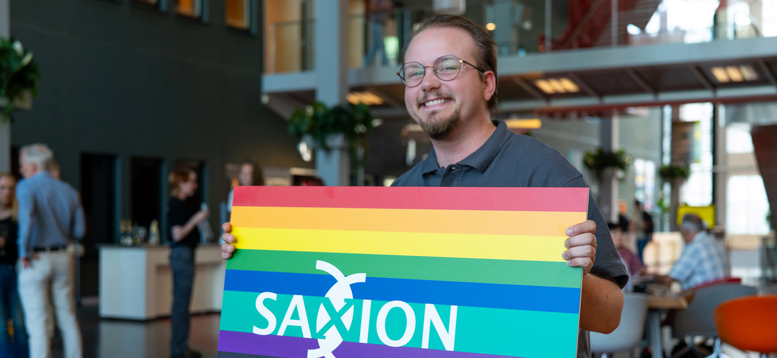 As of now, Saxion has an official Pride emblem: a variant of the organisation logo that can be used to convey support for the LGBTIQ+ community to the outside world. We talk to Stahn Moes, chair of the Queer student association, about the creation and meaning of the emblem: “What I hear around me is that people really appreciate this extra support. It increases the feeling of being welcome.”
